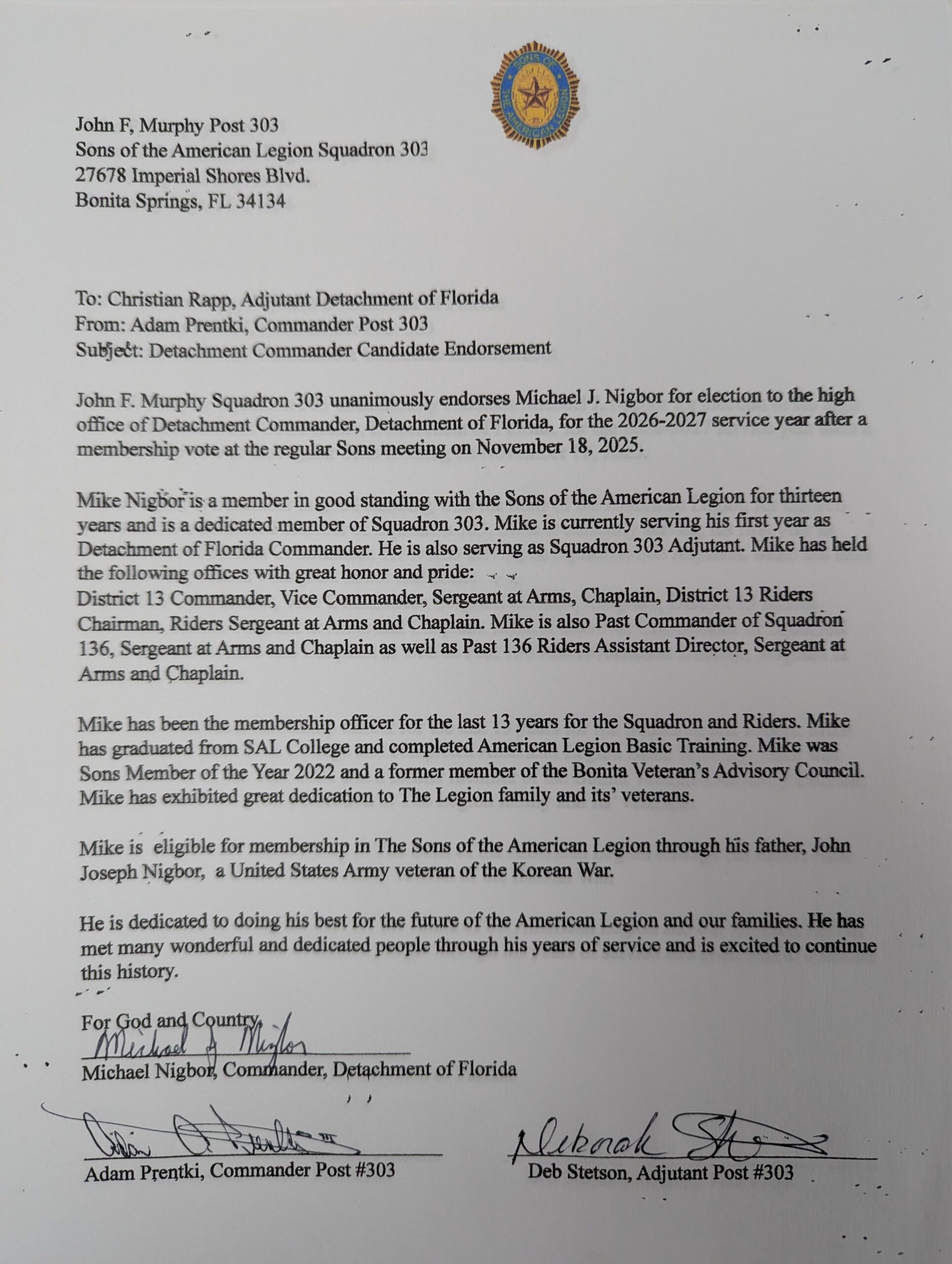 - Endorsement letters can be sent via the US Postal Service to the Detachment Adjutant Christian Rapp – 215 Greenwood Avenue | Lehigh Acres, FL 33936.