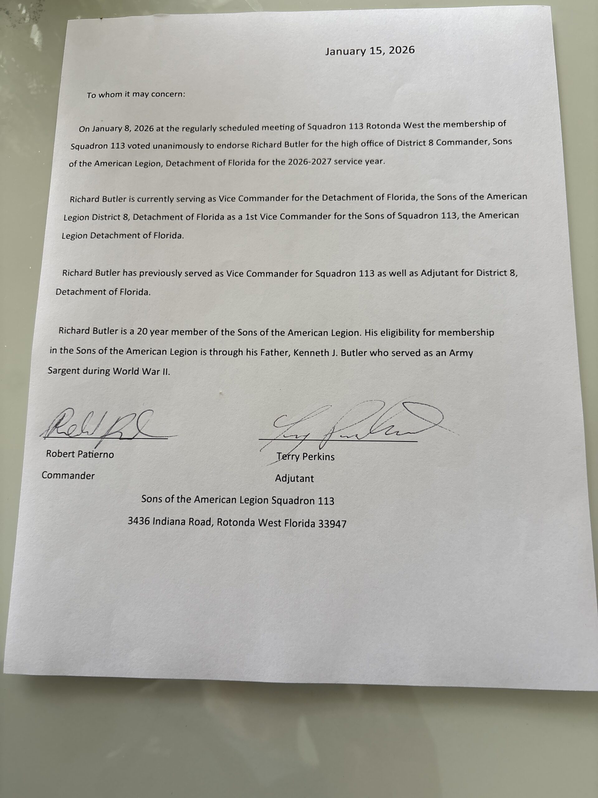 Each endorsement letter must come from a Florida Squadron or Post and must be signed by the Squadron Commander and Squadron Adjutant, or the Post Commander and Post Adjutant or any combination of these.